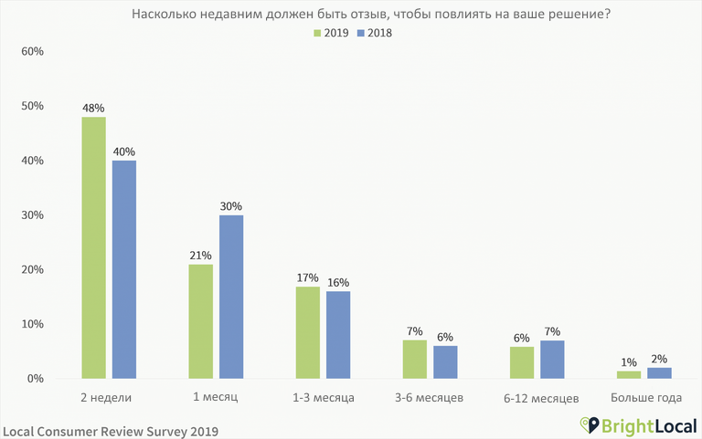 то, как давно был сделан отзыв. 48 % потребителей смотрят лишь те отзывы, что были оставлены не