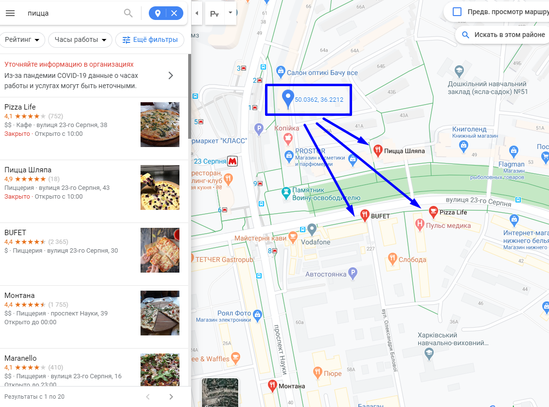 На скрине ниже человек ищет пиццу рядом с домом. Результаты,